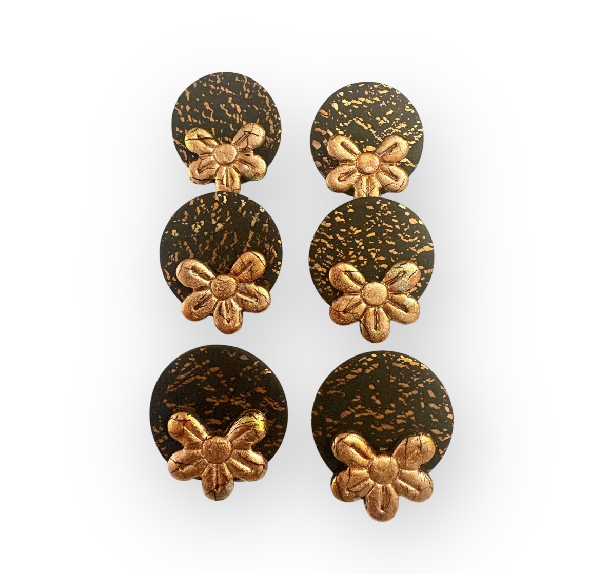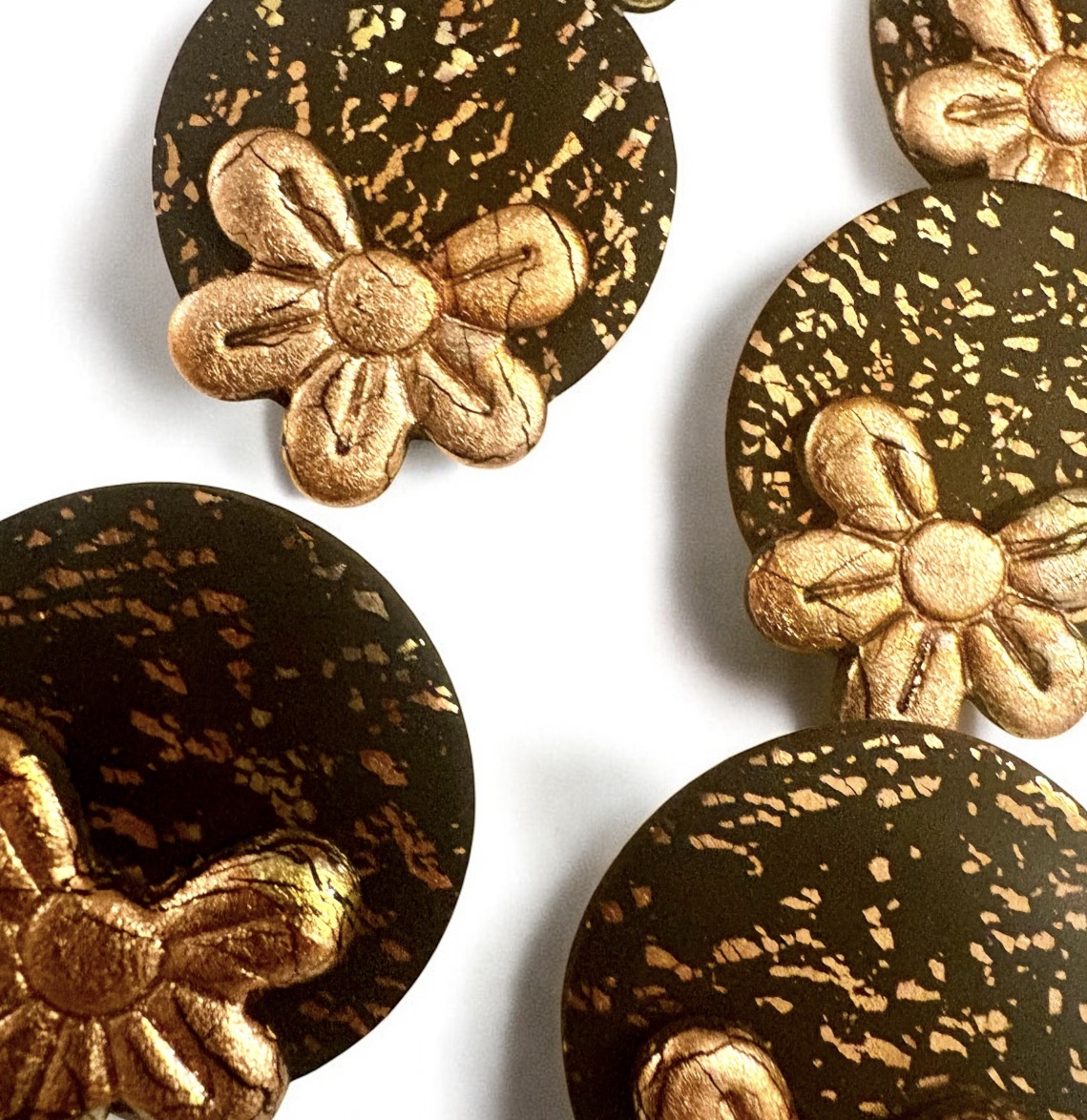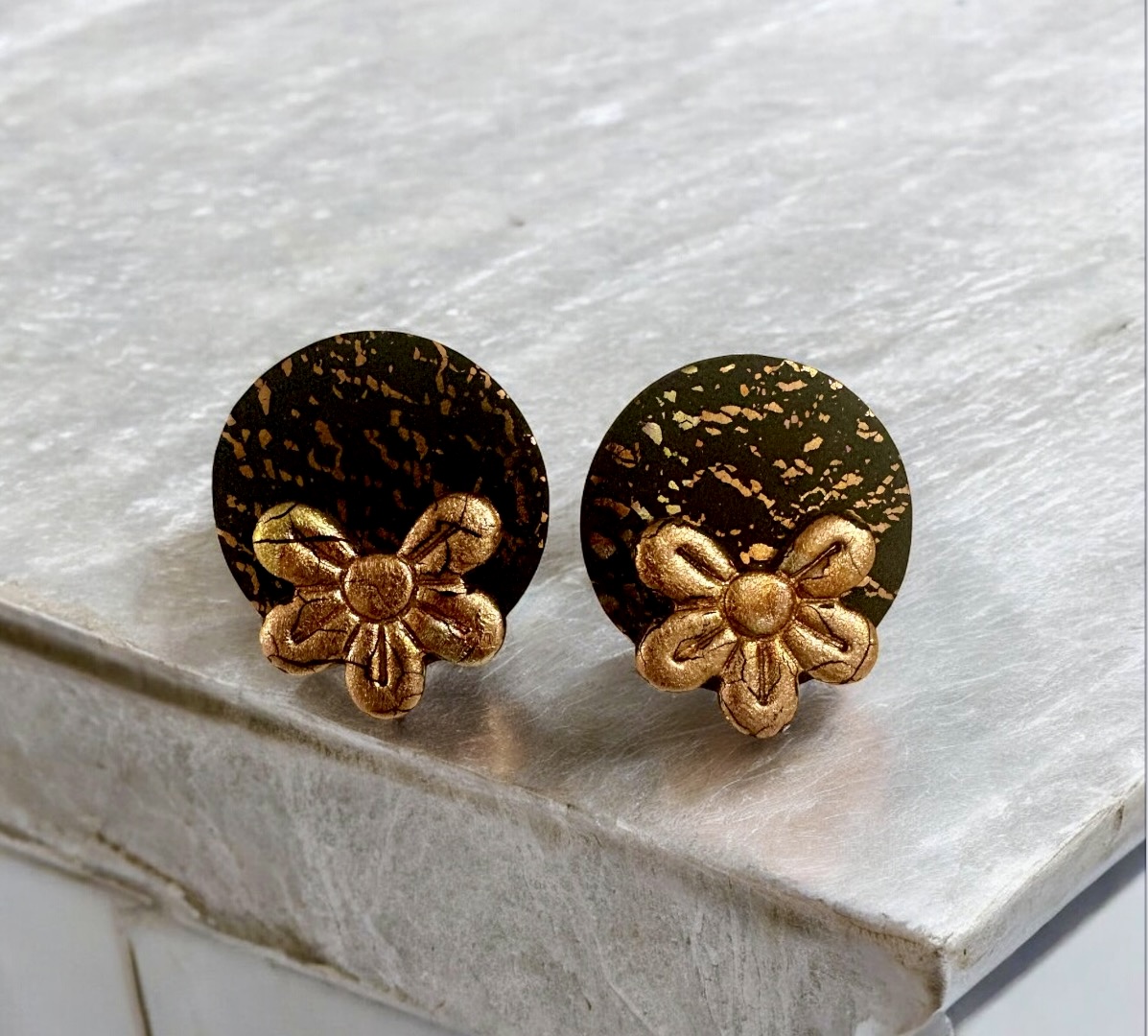Σκουλαρίκια Μπρονζέ Λουλούδι,χειροποίητα από πολυμερικό πηλό σε μαύρο και μπρονζέ μεταλλικό λουλούδι απο φύλλα χρυσού.